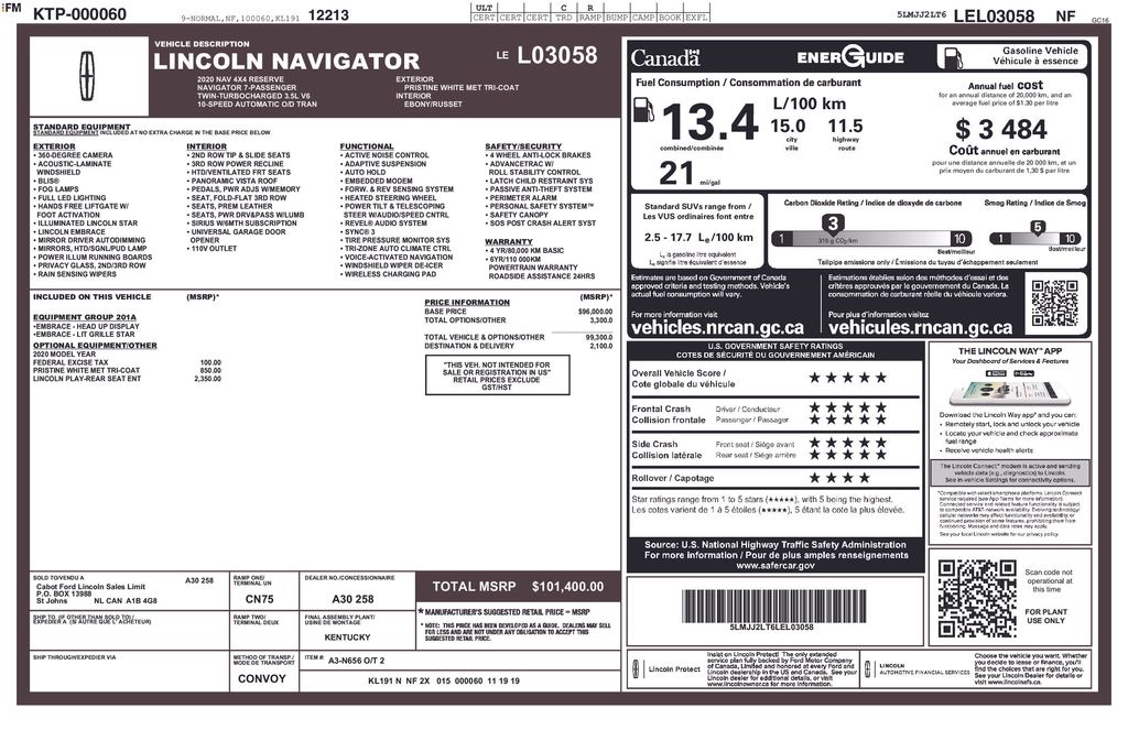 2020 Lincoln Navigator Reserve 4D Sport Utility White Reserve V6 10-Speed Automatic 4WD