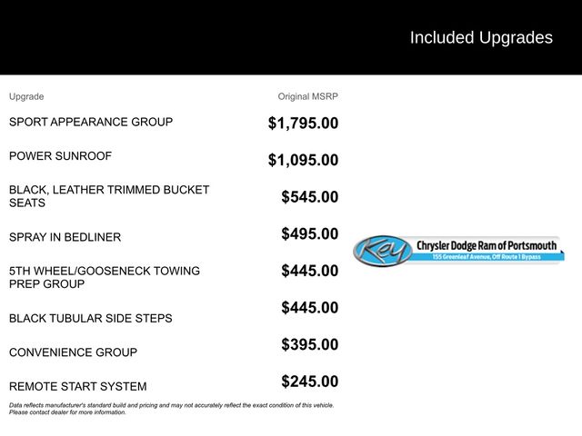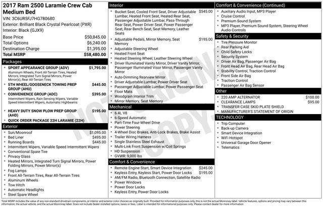 Key Chrysler Dodge Ram of Portsmouth is proud to present you with another True Market Priced Pre-Owned Vehicle. Transparent Pricing Of $ 25735 !! This 2017 Ram 2500 Laramie is loaded with the following Factory Options: Convenience Group (Auto High Beam Headlamp Control and Rain Sensitive Windshield Wipers), Heavy Duty Snow Plow Prep Group, Quick Order Package 22H Laramie (Front Armrest w/Cupholders and Storage Tray), Sport Appearance Group (Bi-Function Black Projector Headlamp, Black Painted Exterior Mirrors, Black Power Fold-Away Mirrors, Black Premium Tail Lamp, Black Ram Head Tailgate Badge, Black Wheel Center Hub, Body Color Door Handles, Body Color Grille w/Black Wave Insert, Flat Black 4x4 Badge, Flat Black Ram 2500 Badge, Painted Front Bumper, Painted Rear Bumper, and Wheels: 20" x 8.0" Black Painted Aluminum), 10 Speakers, 115V Auxiliary Power Outlet, 220 Amp Alternator, 3.73 Axle Ratio, 4-Wheel Disc Brakes, 5th Wheel/Gooseneck Towing Prep Group, ABS brakes, Air Conditioning, Alloy wheels, AM/FM radio: SiriusXM, Audio memory, Auto-dimming door mirrors, Auto-dimming Rear-View mirror, Automatic temperature control, Black Tubular Side Steps, Brake assist, Bumpers: chrome, Clearance Lamps, Compass, Delay-off headlights, Driver door bin, Driver vanity mirror, Dual front impact airbags, Dual front side impact airbags, Electronic Stability Control, Emergency communication system: Uconnect Access, Front anti-roll bar, Front Center Armrest w/Storage, Front dual zone A/C, Front fog lights, Front reading lights, Fully automatic headlights, Garage door transmitter, Heated door mirrors, Heated Front Seats, Heated front seats, Heated steering wheel, Illuminated entry, Keyless Enter-N-Go, Leather steering wheel, Leather Trim 40/20/40 Bench Seat, Low tire pressure warning, Manufacturer's Statement of Origin, Media Hub (USB, AUX), Memory seat, Occupant sensing airbag, Outside temperature display, Overhead airbag, Overhead console, Panic alarm, ParkView Rear Back-Up Camera, Passenger door bin, Passenger vanity mirror, Power Adjustable Pedals w/Memory, Power door mirrors, Power driver seat, Power passenger seat, Power steering, Power Sunroof, Power windows, Radio data system, Radio: Uconnect 3C w/8.4" Display, Radio/Driver Seat/Mirrors/Pedals Memory, Rear seat center armrest, Rear step bumper, Remote keyless entry, Remote Proximity Keyless Entry, Remote Start System, Security system, Speed control, Split folding rear seat, Spray In Bedliner, Steering wheel mounted audio controls, Tachometer, Tilt steering wheel, Traction control, Trip computer, Turn signal indicator mirrors, Variably intermittent wipers, Vendor Painted Cargo Box Tracking, Ventilated front seats, Voltmeter, and Wheels: 18" x 8.0" Polished Aluminum!!