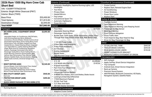 2026 Ram 1500 Big Horn/Lone Star 4D Crew Cab Bright White Clearcoat Big Horn/Lone Star HEMI 5.7L V8 Multi Displacement VVT eTorque 8-Speed Automatic 4WD