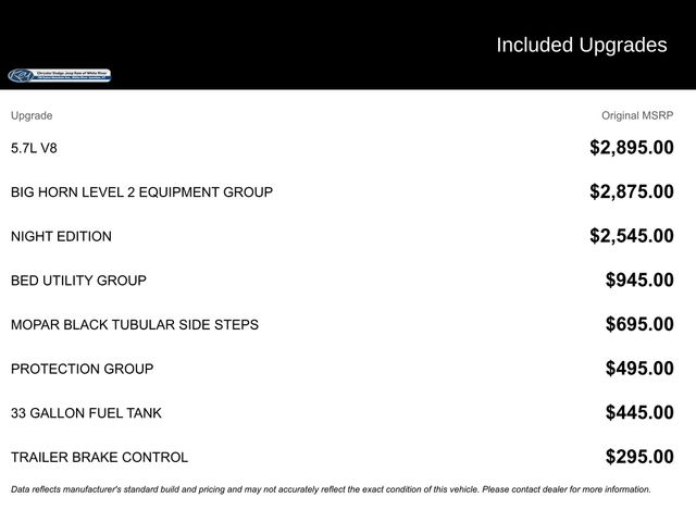 Key Chrysler Dodge Jeep Ram of White River is proud to present you with another True Market Priced Pre-Owned Vehicle. Transparent Pricing Of $ 51499 !! This 2026 Ram 1500 Big Horn/Lone Star is loaded with the following Factory Options: Bed Utility Group (Exterior 115V AC Outlet, MOPAR 4 Adjustable Cargo Tie-Down Hooks, MOPAR Spray in Bedliner, and Pick-Up Box Lighting), Big Horn Level 2 Equipment Group (115V Auxiliary Power Outlet, 115V Auxiliary Rear Power Outlet, 12" Touchscreen Display, 2nd Row in Floor Storage Bins, 3 Rear Seat Head Restraints, 4 Way Front Headrests, 400W Inverter, 4G LTE Wi-Fi Hot Spot, 9 Amplified Speakers with Subwoofer, Air Conditioning ATC with Dual Zone Control, Apple CarPlay, Auto Power-Folding Mirrors, Auto-Dimming Exterior Driver Mirror, Auto-Dimming Rear-View Mirror, Black Exterior Mirrors, Black Premium Power Mirrors, Body Color Fender Flares, Bucket Seats, Center Console Parts Module, Cluster 7.0" TFT Color Display, Configurable Drive Mode, Connected Travel and Traffic Services, Connectivity - US/Canada, Convex Wide-Angle Exterior Mirror Insert, Deluxe Cloth Bucket Seats, Disassociated Touchscreen Display, Exterior Mirrors Courtesy Lamps, Exterior Mirrors with Heating Element, Exterior Mirrors with Supplemental Signals, Front Seat Back Map Pockets, Full Length Floor Console, Global Telematics Box Module, Glove Box Lamp, Google Android Auto, GPS Antenna Input, GPS Navigation, HD Radio, Heated Front Seats, Heated Steering Wheel, Integrated Center Stack Radio, Integrated Voice Command with Bluetooth, Leather Wrapped Steering Wheel, LED Dome Lamp with on/Off Switch, LED Footwell Lighting, Manual Adjust 4-Way Front Passenger Seat, Media Hub with 2 Charge Only USBs, Overhead LED Lamps, Power 2-Way Driver Lumbar Adjust, Power Adjust 8-Way Driver Seat, Power Adjustable Pedals, Premium Overhead Console, Radio: Uconnect 5 Navigation with 12.0" Display, Rear 60/40 Folding Seat, Rear Center Armrest, Rear Power Sliding Window, Rear Window Defroster, Remote Tailgate Release, Security Alarm, SiriusXM Radio Service, SiriusXM with 360L, Steering Wheel Mounted Audio Controls, Sun Visors with Illuminated Vanity Mirrors, Universal Garage Door Opener, and USB Host Flip), Night Edition (Accent Color Door Handles, Accent Color Premium Power Mirrors, Accent Color Tailgate Handle, Anti-Spin Differential Rear Axle, Black Exterior Truck Badging, Black Headlamp Bezels, Black Interior Accents, Black Painted Exterior Mirrors Caps, Black Tail Lamp Bezels, Body Color Front Bumper, Body Color Rear Bumper with Step Pads, Dual Exhaust with Black Tips, Grille Black Surround Black Mesh, RAM Grille Badge - Black, and Wheels: 20" x 9.0" Aluminum Painted Clad), Protection Group (Tow Hooks), Quick Order Package 27Z Big Horn, 33 Gallon Fuel Tank, 4-Wheel Disc Brakes, 48V Belt Starter Generator, 6 Speakers, ABS brakes, Air Conditioning, Alloy wheels, AM/FM radio, Apple CarPlay/Android Auto, Auto High-beam Headlights, Brake assist, Bumpers: ch